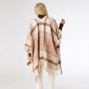 The Varese Plaid Wrap in natural and dusty salmon colors offers cozy warmth with a boho vibe. Soft fabric and classic plaid with fringe details make it a stylish, easy layer for any occasion.